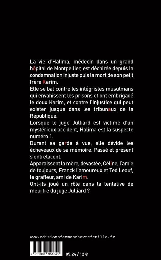 La vie d’Halima, médecin dans un grand hôpital de Montpellier, est déchirée depuis la condamnation injuste puis la mort de son petit frère Karim. Elle se bat contre les intégristes musulmans qui envahissent les prisons et ont embrigadé le doux Karim, et contre l’injustice qui peut exister jusque dans les tribunaux de la République. Lorsque le juge Julliard est victime d’un mystérieux accident, Halima est la suspecte numéro 1. Durant sa garde à vue, elle dévide les écheveaux de sa mémoire. Passé et présent s’entrelacent. Apparaissent la mère, dévastée, Céline, l’amie de toujours, Franck l’amoureux et Ted Leouf, le graffeur, ami de Karim. Ont-ils joué un rôle dans la tentative de meurtre du juge Julliard ? Note de l’éditrice : Ce roman se passe à Montpellier et dans ses alentours. Il dénonce autant les pratiques des juges d'extrême droite que l'embrigadement des jeunes par les islamistes en prison. Il s'adresse autant aux amateurs de romans noirs qu'aux lecteurs grands adolescents et jeunes adultes.