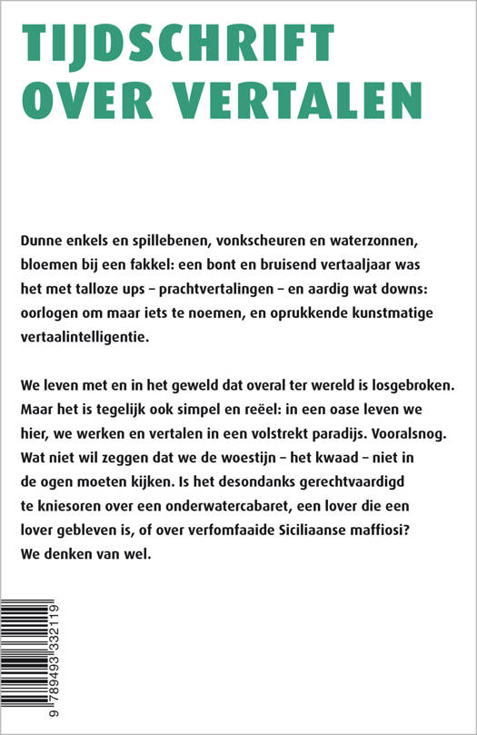 We leven met en in het geweld dat overal ter wereld is losgebroken. Maar het is tegelijk ook simpel en reëel: in een oase leven we hier, we werken en vertalen in een volstrekt paradijs. Vooralsnog. Wat niet wil zeggen dat we de woestijn – het kwaad – niet in de ogen moeten kijken. Is het desondanks gerechtvaardigd te kniesoren over een onderwatercabaret, een lover die een lover gebleven is, of over verfomfaaide Siciliaanse maffiosi? We denken van wel.