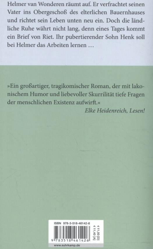 Helmer van Wonderen räumt auf. Er verfrachtet seinen bettlägerigen Vater ins Obergeschoß des alten Bauernhauses, entrümpelt das Erdgeschoss, streicht die Wände und schafft neue Möbel an. Das Gemälde mit den schwarzen Schafen, die Fotografien von Mutter und die alte Standuhr kommen nach oben, alle Pflanzen, die blühen können, auf den Misthaufen. Und da Vater ihm nicht den Gefallen tut, einfach zu verschwinden, sich von einem Windstoß hinwegfegen zu lassen oder wenigstens zu sterben, richtet der Sohn sein Leben unten neu ein. Doch die ländliche Ruhe währt nicht lang, denn Helmers Neffe Henk, der pubertierende Sohn seines verstorbenen Zwillingsbruders, soll bei seinem Onkel das Arbeiten lernen ...