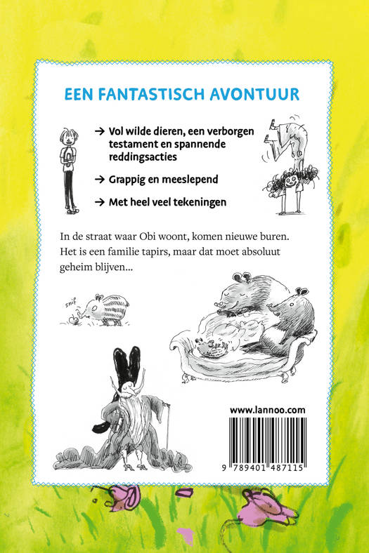 Vol wilde dieren, een verborgen testament en spannende reddingsacties Grappig en meeslepend Met heel veel tekeningenIn de straat waar Obi woont, komen nieuwe buren. Het is een familie tapirs, maar dat moet absoluut geheim blijven...