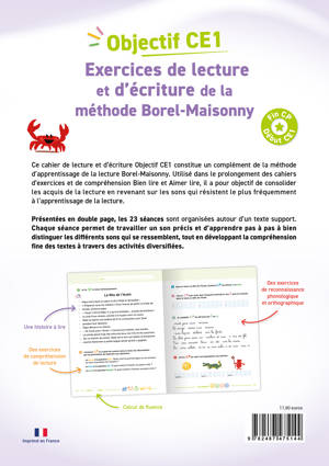 Ce cahier de lecture et d’écriture Objectif CE1 constitue un complément de la méthode d’apprentissage de la lecture Borel-Maisonny. Utilisé dans le prolongement des cahiers d’exercices et de compréhension Bien lire et Aimer lire, il a pour objectif de consolider les acquis de la lecture en revenant sur les sons qui résistent le plus fréquemment à l’apprentissage de la lecture.