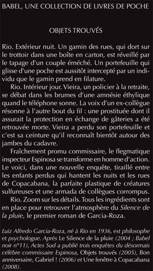 «Luiz Alfredo Garcia-Roza, né à Rio en 1936, est philosophe et psychologue. Après» Le Silence de la pluie« (2004 ; Babel noir n°11), Actes Sud a publié trois enquêtes du désormais célèbre commissaire Espinosa, »Objets trouvés «(2005), »Bon anniversaire, Gabriel« ! (2006) et» Une fenêtre à Copacabana« (2008).»