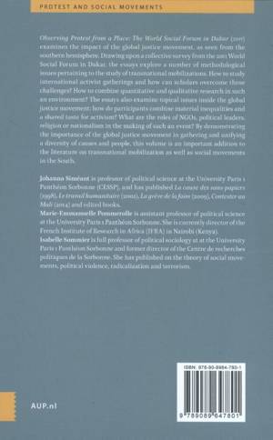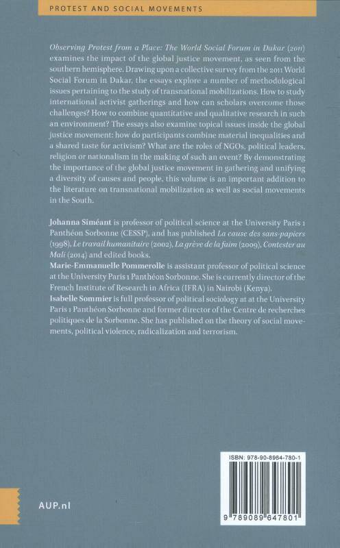 Social movements throughout the world have been central to history, politics, society, and culture. Observing Protest from a Place examines the impact of one such campaign, the global justice movement, as seen from the southern hemisphere. Drawing upon a collective survey from the 2011 World Social Forum in Dakar, the essays explore a number of vital issues, including the methodological problems of studying international activist gatherings and how scholars can overcome those challenges. By demonstrating the importance of the global justice movement and the role of nongovernmental organizations for participants in the southern hemisphere, this volume is an important addition to the literature on community action.