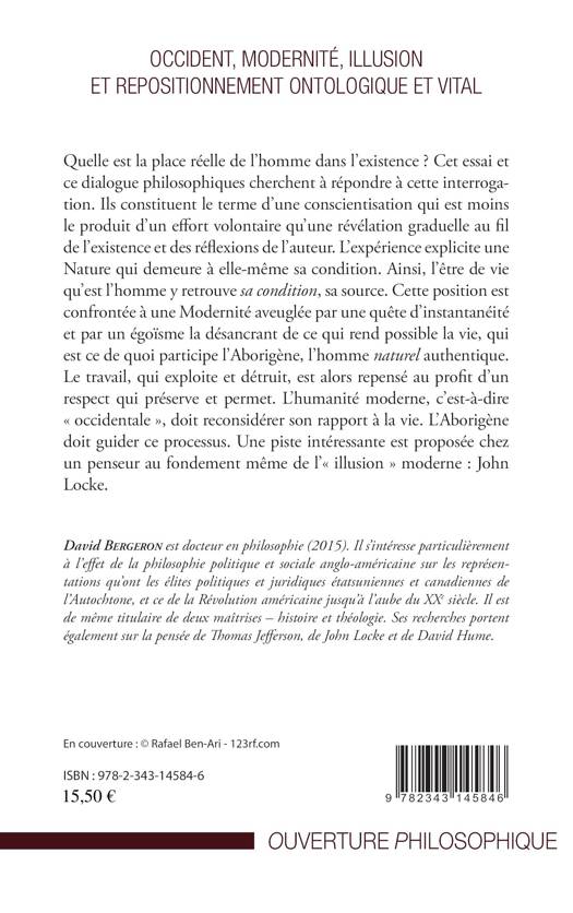 Quelle est la place réelle de l'homme dans l'existence ? L'expérience explicite une Nature qui demeure à elle-même sa condition. Ainsi, l'être de vie qu'est l'homme y retrouve sa source. Cette position est confrontée à une Modernité aveuglée par une quête d'instantanéité et par un égoïsme la désancrant de ce qui rend possible la vie, qui est ce de quoi participe l'Aborigène, l'homme naturel authentique. Le travail, qui exploite et détruit, est alors repensé au profit d'un respect qui préserve et permet. L'humanité moderne, occidentale, doit reconsidérer son rapport à la vie, guidé par l'Aborigène.