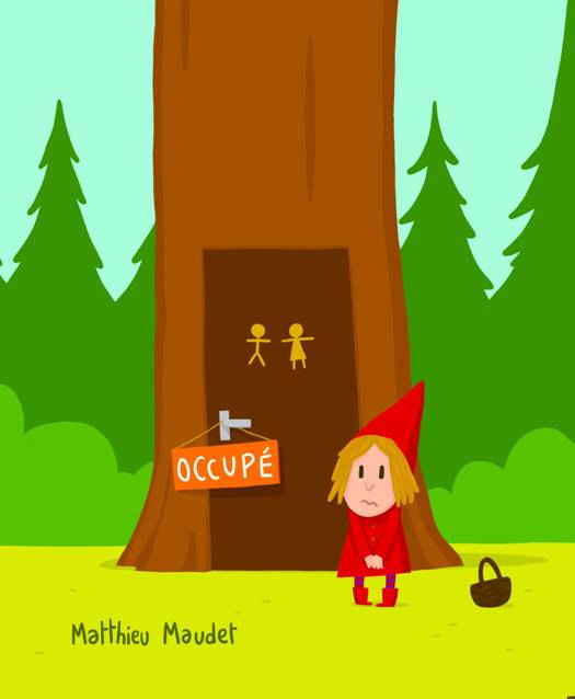 Le Petit Chaperon rouge aimerait bien aller aux toilettes mais... c'est occupé ! Arrive un petit cochon qui doit donc lui aussi attendre. « C'est urgent ! » crie un deuxième petit cochon en arrivant, mais il doit faire la queue ! Et alors, qui est dans les toilettes et fait fuir tout le monde en sortant ?