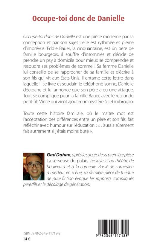 Occupe-toi donc de Danielle est une pièce moderne par sa conception et par son sujet. Eddie Bauer, la cinquantaine, est père de famille bourgeois, il souffre d'insomnies et décide de prendre un psy à domicile pour mieux se comprendre et résoudre ses problèmes de sommeil. Sa femme Danielle lui conseille de se rapprocher de sa famille et d'écrire à son fils qui vit au États-Unis. Toute cette histoire familiale, où le maître mot est l'acceptation des différences entre un père et son fils, fait réfléchir avec humour sur l'éducation.