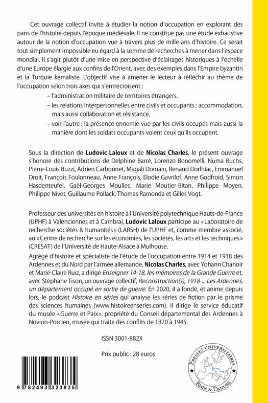 Cet ouvrage collectif invite à étudier la notion d’occupation en explorant des pans de l’histoire depuis l’époque médiévale. Il ne constitue pas une étude exhaustive autour de la notion d’occupation vue à travers plus de mille ans d’histoire. Ce serait tout simplement impossible eu égard à la somme de recherches à mener dans l’espace mondial. Il s’agit plutôt d’une mise en perspective d’éclairages historiques à l’échelle d’une Europe élargie aux confins de l’Orient, avec des exemples dans l’Empire byzantin et la Turquie kemaliste. L’objectif vise à amener le lecteur à réfléchir au thème de l’occupation selon trois axes qui s’entrecroisent : – l’administration militaire de territoires étrangers. – les relations interpersonnelles entre civils et occupants : accommodation, mais aussi collaboration et résistance. – voir l’autre : la présence ennemie vue par les civils occupés mais aussi la manière dont les soldats occupants voient ceux qu’ils occupent.