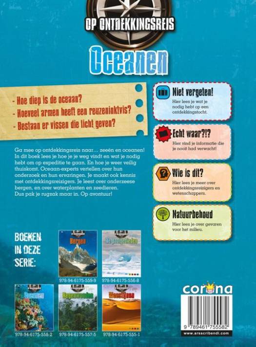 Ga mee op ontdekkingsreis naar... zeeën en oceanen! In dit boek lees je hoe je je weg vindt en wat je nodig hebt om op expeditie te gaan. En hoe je weer veilig thuiskomt. Oceaan-experts vertellen over hun onderzoek en hun ervaringen. Je maakt ook kennis met ontdekkingsreizigers. Je leest over onderzeese bergen, en over waterplanten en zeedieren.