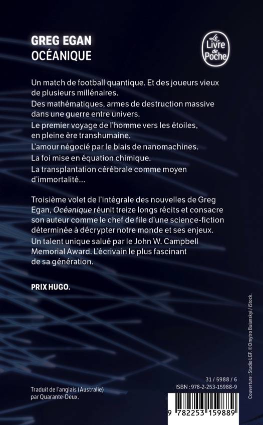 Un match de football quantique. Et des joueurs vieux de plusieurs millénaires. Des mathématiques armes de destruction massive dans une guerre entre univers. Le premier voyage de l’homme vers les étoiles, en pleine ère transhumaine. L’amour négocié par le biais de nanomachines. La foi mise en équation chimique. La transplantation cérébrale comme moyen d’immortalité... Océanique, troisième volet de l’intégrale des nouvelles de Greg Egan, réunit treize longs récits et consacre son auteur comme le chef de file d’une science-fiction déterminée à décrypter notre monde et ses enjeux. Un talent unique salué par le prix Hugo et le John W. Campbell Memorial Award. L’écrivain le plus fascinant de sa génération.