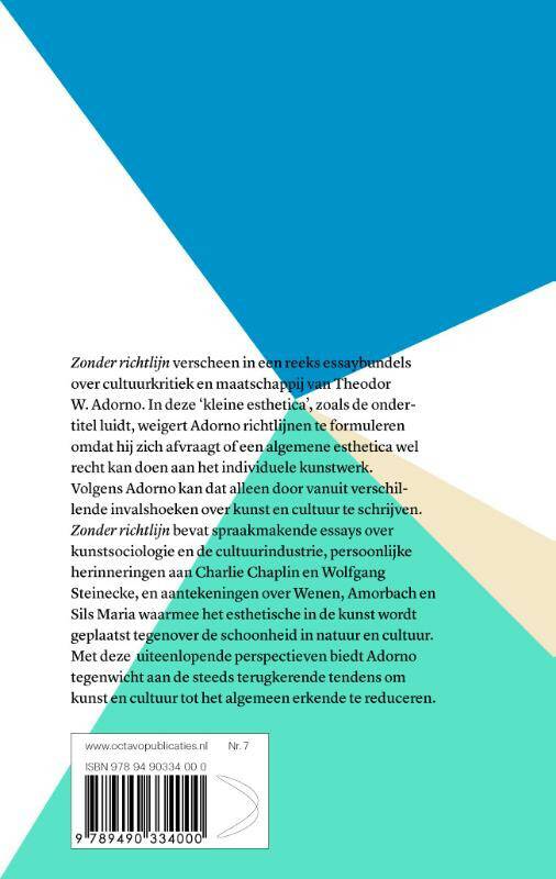 "Zonder richtlijn" is het tweede deel van een reeks essaybundels over cultuurkritiek en maatschappij die door Adorno zelf is samengesteld. In deze 'kleine esthetica', zoals de ondertitel luidt, weigert Adorno richtlijnen te formuleren omdat hij zich afvraagt of een algemene esthetica wel recht kan doen aan het individuele kunstwerk. Volgens Adorno kan dat alleen door vanuit verschillende invalshoeken over kunst en cultuur te schrijven. "Zonder richtlijn" bevat spraakmakende essays over kunstsociologie, de cultuurindustrie, naast meer persoonlijke herinneringen aan Charlie Chaplin en Wolfgang Steinecke. Bovendien wisselt Adorno verhandelingen over esthetiek af met aantekeningen over Wenen, Amorbach en Sils Maria, waarmee hij het esthetische in de kunst plaatst tegenover de schoonheid in natuur en cultuur. Met deze uiteenlopende perspectieven biedt Adorno tegenwicht aan de steeds terugkerende tendens om kunst en cultuur tot het algemeen erkende te reduceren.