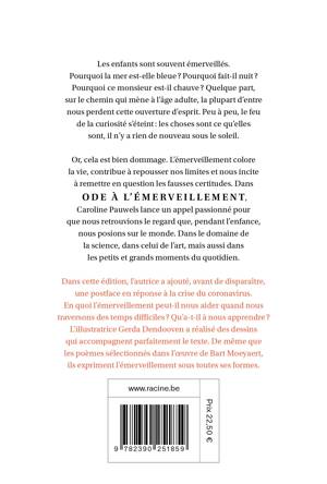 Dans cette édition, l'autrice a ajouté, avant de disparaître, une postface en réponse à la crise du coronavirus. En quoi l'émerveillement peut-il nous aider quand nous traversons des temps difficiles ? Qu'a-t-il à nous apprendre ? L'illustratrice Gerda Dendooven a réalisé des dessins qui accompagnent parfaitement le texte. De même que les poèmes sélectionnés dans l'oeuvre de Bart Moeyaert qui expriment l'émerveillement sous toutes ses formes.
