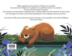 Odile n’apprécie pas les mêmes activités que sa famille. En secret, elle s’éclipse et va profiter de ce qu’offre la nature à sa manière. Un jour, son frère ainé va la suivre. Avec surprise et contrariété, il comprend que sa cadette préfère un autre mode de vie que le sien. Il se sent jugé et en colère, mais Odile, bienveillante, va lui expliquer qu’il n’en est rien... Avec bonté, Odile nous montre qu’on peut s’accepter, vivre ensemble, tout en étant différent les uns des autres.