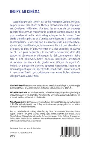 Accompagné vers la mort par sa fille Antigone, Œdipe, aveugle, ne pourra voir ni la chute de Thèbes, ni l’avènement du septième art. Quelques millénaires plus tard, les auteurs de cet ouvrage collectif font acte de regard sur la situation contemporaine de la psychanalyse et de l’art cinématographique. Par le prisme d’une étude transdisciplinaire et d’un nouage nécessaire à la recherche contemporaine, le cinéma part à la rencontre de la psychanalyse, s’y associe, s’en détache, et inversement. Face à une abondance d’images de plus en plus violentes et à des angoisses massives de plus en plus fréquentes, le spectateur-patient (se) doit (de) supporter, témoigner et démasquer le réel contemporain ; faire face à des bouleversements sociaux, politiques, artistiques et moraux, en tentant de garder une éthique du regard (S. Rollet). En parcourant diverses époques historiques, sociales et cinématographiques, les spectres de Freud et de Lacan viendront ici rencontrer David Lynch, dialoguer avec Xavier Dolan, et fumer un cigare avec Gaspar Noé.