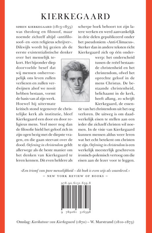 «Oefening in christendom» geldt allerwege als de beste manier om het denken van Søren Kierkegaard te leren kennen. Dit kristalheldere boek behoort tot zijn latere werken en werd aanvankelijk in drie delen gepubliceerd onder het pseudoniem «Anti-Climacus». Sterker dan in andere teksten richt Kier-kegaard zich op één onderwerp: het onderscheid tussen de reëel bestaande christenheid en het chris-tendom, ofwel het oprechte geloof in de mens Jezus Christus. De bestaande christenheid, belichaamt in de kerk, heeft allang, stelt Kierkegaard, de essentie van het christendom uit het oog verloren en verraden. De uitweg is om opnieuw eisen te stellen aan een ieder die zich christen wil noemen. In de visie van Kierkegaard kunnen mensen zo weer leren en ervaren wat het werkelijk betekent om waar-achtig christen te zijn.