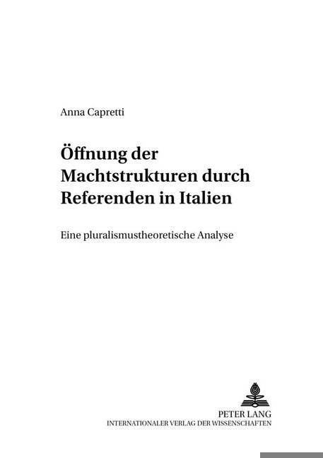 Referenden haben in der Geschichte des modernen Italiens eine Schlüsselrolle bei der Überwindung der politischen Stagnation gespielt. Direktdemokratische Instrumente erwiesen und bewährten sich im Laufe der Jahre als gefragtes Mittel zur Öffnung der Machtstruktur und als wirksames Reforminstrument zur Kontrolle des Machtkartells der etablierten Parteien. Erkenntnisinteresse dieses Buches ist es, die Wirkungsaspekte von Referenden in der italienischen Machtstruktur seit Einführung des Ausführungsgesetzes (1970) anhand vierer Fallbeispiele und auf der Basis der Pluralismustheorie anzugeben. Das Buch liefert darüber hinaus einen Überblick über direktdemokratische Verfahren und deren Anwendung sowie die Grundstrukturen des politischen Systems und der Gesellschaft des Landes.