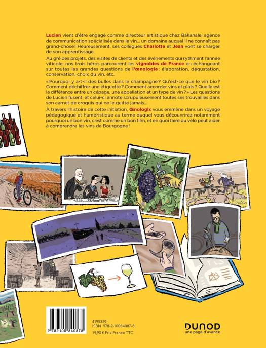 Lucien vient d’être engagé comme directeur artistique chez Bakanale, agence de communication spécialisée dans le vin… un domaine auquel il ne connaît pas grand-chose ! Heureusement, ses collègues Charlotte et Jean vont se charger de son apprentissage. Au gré des projets, des visites de clients et des événements qui rythment l’année viticole, nos trois héros parcourent lesvignobles de France en échangeant sur toutes les grandes questions de l’œnologie : élaboration, dégustation, conservation, choix du vin, etc. « Pourquoi y a-t-il des bulles dans le champagne ? Qu’est-ce que le vin bio ? Comment déchiffrer une étiquette ? Comment accorder vins et plats ? Quelle est la différence entre un cépage, une appellation et un type de vin ? » Les questions de Lucien fusent, et celui-ci annote scrupuleusement toutes ses trouvailles dans son carnet de croquis qui ne le quitte jamais… À travers l’histoire de cette initiation, Œnologix vous emmène dans un voyage pédagogique et humoristique au terme duquel vous découvrirez notamment pourquoi un bon vin, c’est comme un bon film, et en quoi faire du vélo peut aider à comprendre les vins de Bourgogne !