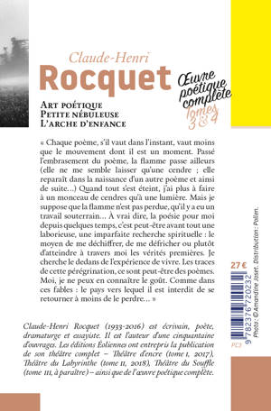 Art poétique Petite nébuleuse L'arche d'enfance « Chaque poème, s'il vaut dans l'instant, vaut moins que le mouvement dont il est un moment. Passé l'embrasement du poème, la flamme passe ailleurs (elle ne me semble laisser qu'une cendre ; elle reparaît dans la naissance d'un autre poème et ainsi de suite...) Quand tout s'est éteint, j'ai plus à faire à un monceau de cendres qu'à une lumière. Mais je suppose que la flamme n'est pas perdue, qu'il y a eu un travail souterrain... À vrai dire, la poésie pour moi depuis quelques temps, c'est peut-être avant tout une laborieuse, une imparfaite recherche spirituelle : le moyen de me déchiffrer, de me défricher ou plutôt d'atteindre à travers moi les vérités premières. Je cherche le dedans de l'expérience de vivre. Les traces de cette pérégrination, ce sont peut-être des poèmes. Moi, je ne peux en connaître le goût. Comme dans ces fables : le pays vers lequel il est interdit de se retourner à moins de le perdre... »