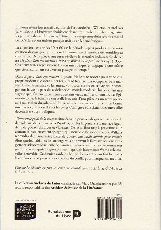 L'imaginaire de Paul Willems est l'un des plus singuliers qu'ait portés la littérature de la seconde moitié du XXe siècle. Célébré sur les plus grandes scènes d'Europe, son théâtre est venu y imposer une dimension de fantaisie qui connaît peu d'équivalent. La charnière des années 1950 et 1960 est la période la plus productive de sa carrière dramatique. L'auteur entre dans la pleine maturité, avec deux pièces majeures : Il pleut dans ma maison (1958) et Warna ou le poids de la neige (1962). Devenus pratiquement introuvables, ces deux textes représentent les versants comique et tragique d'une même question : comment survivre au passage du temps ?