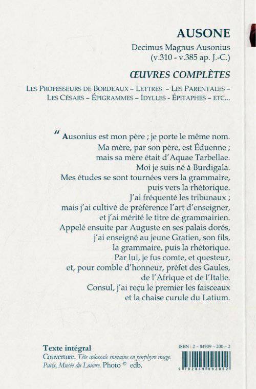 Texte intégral. Traduit du latin par Charles Pommier. Le volume comprend : Préfaces ; Épigrammes ; Éphémérides ; Parentales ; Souvenirs aux professeurs de Bordeaux ; Épitaphes ; Sur Suétone ; Quatrains sur les empereurs ; Ordre des villes ; Jeu des 7 sages ; Sentences ; Idylles ; Fragments ; Lettres ; Action de grâce à Gratien.