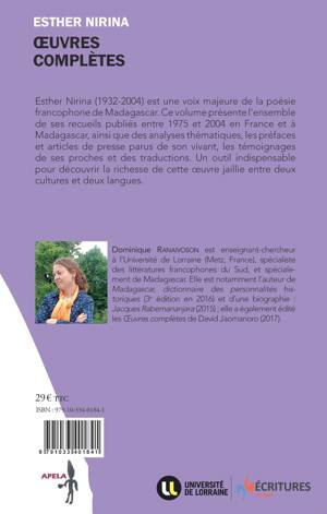 Esther Nirina (1932-2004) est une voix majeure de la poésie francophone de Madagascar. Ce volume présente l'ensemble de ses recueils publiés entre 1975 et 2004 en France et à Madagascar, ainsi que des analyses thématiques, les préfaces et articles de presse parus de son vivant, les témoignages de ses proches et des traductions. Un outil indispensable pour découvrir la richesse de cette oeuvre jaillie entre deux cultures et deux langues.