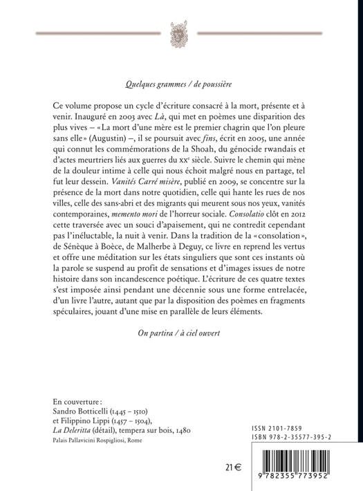 Le Tome 1 des Œuvres Poétiques de Yves Boudier contient la réédition intégrale des ouvrages suivants :- Là, publié chez Farrago en 2003, est une mise en poèmes d’une disparition des plus vives — « La mort d’une mère est le premier chagrin que l’on pleure sans elle » (Augustin) ;– fins, publié chez Comp’Act en 2005, une année, qui connut les commémorations de la Shoah, du génocide rwandais et d’actes meurtriers liés aux guerres du xxe siècle. Suivre le chemin qui mène de la douleur intime à celle qui nous échoit malgré nous en partage, tel fut leur dessein– Vanités Carré misère, « Propos d’avant » de Michel Deguy, publié à L’Act Mem, en 2009, se concentre sur la présence de la mort dans notre quotidien, celle qui hante les rues de nos villes, celle des sans-abri et des migrants qui meurent sous nos yeux, vanités contemporaines, memento mori de l’horreur sociale. – Consolatio, Postface La mort au Carré de Martin Rueff, publié chez Argol, en 2012, clôt cette traversée avec un souci d’apaisement, qui ne contredit cependant pas l’inéluctable, la nuit à venir.