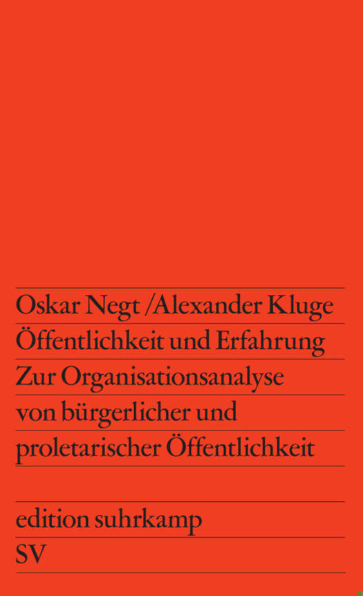»Unser politisches Interesse an diesem Buch ist es, einen Rahmen für eine Diskussion zu setzen, die die analytischen Begriffe der politischen Ökonomie nach unten, zu den wirklichen Erfahrungen der Menschen hin, öffnet.« Die Themen der Studie sind: Öffentlichkeit als Organisationsform gesellschaftlicher Erfahrung; Erscheinungsbild und geschichtliche Produktionsstruktur von Öffentlichkeit; bürgerliche Öffentlichkeit, überlagert durch die Öffentlichkeiten des kapitalistischen Produktionsprozesses; Erfahrung und Phantasie; lebensgeschichtlicher Aufbau der Erfahrung; Öffentlichkeit als gesamtgesellschaftliche Scheinsynthese; Abweisung des proletarischen Lebenszusammenhangs in der bürgerlichen Öffentlichkeit; die Dialektik von Produktion, Politik, Öffentlichkeit und Erfahrung in den Organisationsansätzen der Arbeiterbewegung; Fernsehen, privatwirtschaftliche Bewußtseinsindustrie (Medienverbund); »Öffentlichkeit als kollektiver Produktionsprozeß, dessen Gegenstand zusammenhängende menschliche Sinnlichkeit ist«. - Das Buch ist von Oskar Negt und Alexander Kluge Satz für Satz gemeinsam geschrieben. Es ist ein Versuch, die Zusammenhänge von Öffentlichkeit und Erfahrung begrifflich neu zu bestimmen.