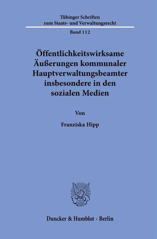 English summary: Publicly Effective Statements by Municipal Administrators Especially on Social Media Platforms The author researches the legislative framework of publicly effective statements by municipal administrators, focusing especially on statements made via social media. She analyses the reasons why the German constitution stipulates communication with the public. The main focus lies on examining the prerequisites and limits of statements by municipal administrators, in particular statements related to more than one municipal function. German description: Ausserungen von Amtstragern sind regelmassig Gegenstand der politischen und rechtswissenschaftlichen Debatte. Dies nimmt die Autorin zum Anlass, die in dieser Diskussion bislang weitgehend aussen vor gebliebenen Ausserungen kommunaler Hauptverwaltungsbeamter zu untersuchen. Dabei legt sie ein besonderes Augenmerk auf Ausserungen in den sozialen Medien, an denen die speziellen Anforderungen an amtliche Kommunikation besonders deutlich werden. Neben der Notwendigkeit und den Modalitaten der Abgrenzung amtlicher von privaten Ausserungen wird herausgearbeitet, warum das Grundgesetz eine Kommunikation von Burgermeistern oder Landraten mit den Burgern vorsieht. Den Schwerpunkt bildet die Untersuchung der Voraussetzungen und Grenzen rechtmassiger amtlicher Ausserungen kommunaler Hauptverwaltungsbeamter. Hierbei finden Ausserungen besondere Beachtung, die einen Bezug zu mehr als einem kommunalrechtlichen Aufgabenkreis aufweisen.