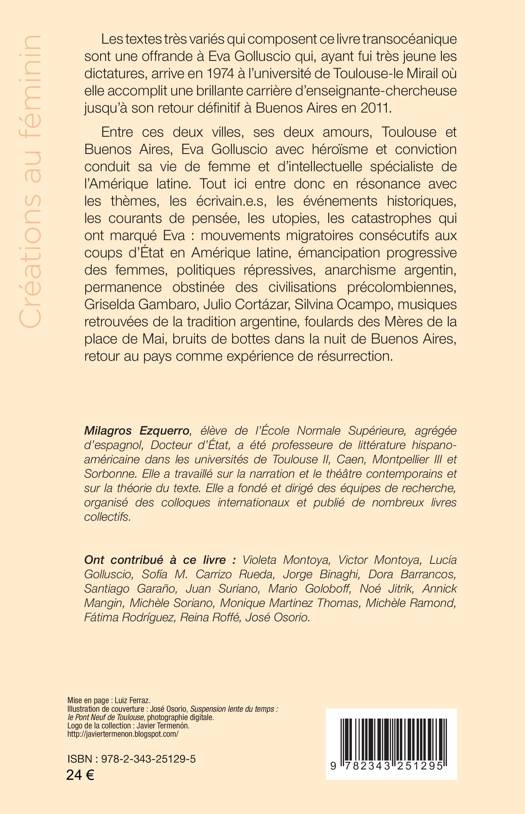 Les textes très variés qui composent ce livre transocéanique sont une offrande à Eva Golluscio qui, ayant fui très jeune les dictatures, arrive en 1974 à l’université de Toulouse-le Mirail où elle accomplit une brillante carrière d’enseignante-chercheuse jusqu’à son retour dénitif à Buenos Aires en 2011. Entre ces deux villes, ses deux amours, Toulouse et Buenos Aires, Eva Golluscio avec héroïsme et conviction conduit sa vie de femme et d’intellectuelle spécialiste de l’Amérique latine. Tout ici entre donc en résonance avec les thèmes, les écrivain.e.s, les événements historiques, les courants de pensée, les utopies, les catastrophes qui ont marqué Eva : mouvements migratoires consécutifs aux coups d’État en Amérique latine, émancipation progressive des femmes, politiques répressives, anarchisme argentin, permanence obstinée des civilisations précolombiennes, Griselda Gambaro, Julio Cortázar, Silvina Ocampo, musiques retrouvées de la tradition argentine, foulards des Mères de la place de Mai, bruits de bottes dans la nuit de Buenos Aires, retour au pays comme expérience de résurrection