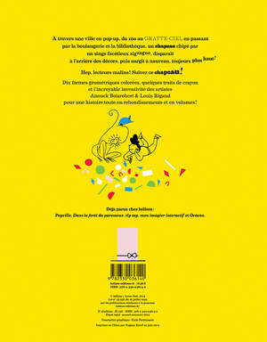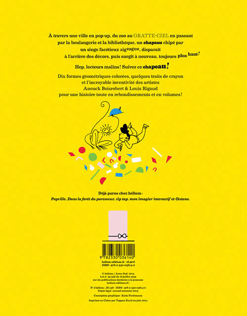 À travers une ville en pop-up, du zoo au gratte-ciel en passant par la boulangerie et la bibliothèque, un chapeau chipé par un singe facétieux zigzague, disparaît à l'arrière des décors, puis surgit à nouveau, toujours plus haut !