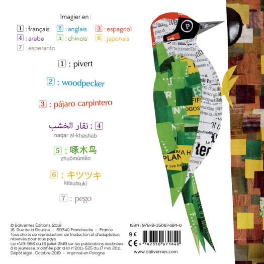 Un imagier multilingue dans lequel les illustrations sont réalisées en collages. L'originalité du graphisme est accessible aux enfants tout en restant de qualité. Même si le multilingue peut n'être pour beaucoup qu'un complément amusant à l'imagier, il peut aussi être particulièrement intéressant pour les familles composées de différentes nationalités, ou venant de migrer dans un nouveau pays, ou aussi pour ceux qui veulent faire découvrir aux plus jeunes leurs racines familiales. Cet imagier des oiseaux est réalisé en Français, Anglais, Chinois, Espagnol, Japonais et Arabe.