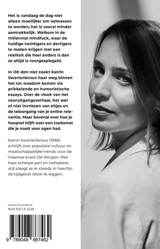 In OK dan niet zoekt Katrin Swartenbroux haar weg binnen het tot wasdom komen via prikkelende en humoristische essays. Over de vloek van het vooruitgangsverhaal, het wel of niet invriezen van eitjes en de teloorgang van je online relevantie. Maar bovenal over hoe je hoopvol blijft over een toekomst die je nooit voor ogen had.