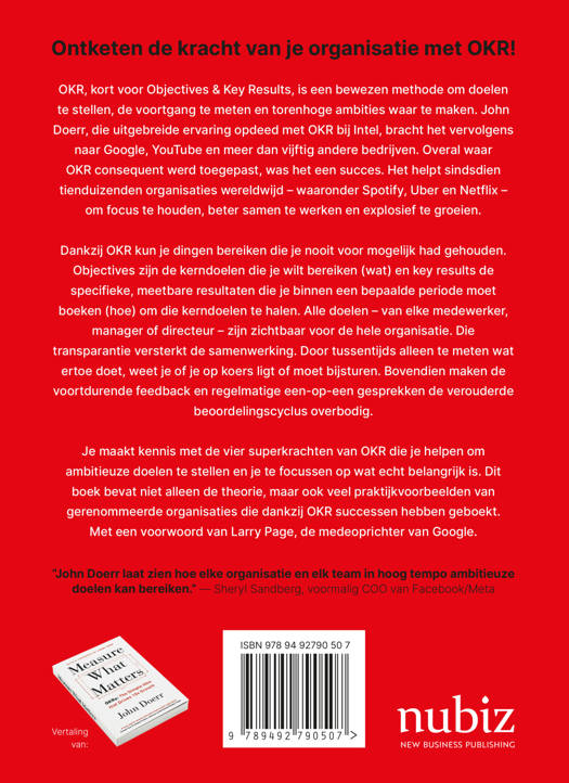 OKR, kort voor Objectives & Key Results, is een bewezen methode om doelen te stellen, de voortgang te meten en torenhoge ambities waar te maken. John Doerr, die uitgebreide ervaring opdeed met OKR bij Intel, bracht het vervolgens naar Google, YouTube en meer dan vijftig andere bedrijven. Overal waar OKR consequent werd toegepast, was het een succes. Het helpt sindsdien tienduizenden organisaties wereldwijd om focus te houden, beter samen te werken en explosief te groeien.