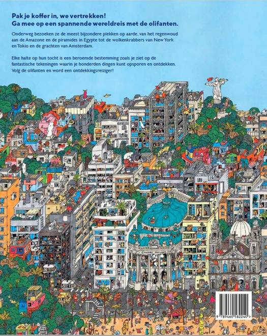 Onderweg bezoeken ze de meest bijzondere plekken op aarde, van het regenwoud aan de Amazone en de piramides in Egypte tot de wolkenkrabbers van New York en Tokio en de grachten van Amsterdam. Elke halte op hun tocht is een beroemde bestemming zoals je ziet op de fantastische tekeningen waarin je honderden dingen kunt opsporen en ontdekken. Volg de olifanten en word een ontdekkingsreiziger!