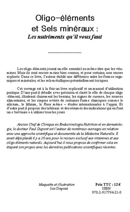 Les oligo-éléments jouent un rôle essentiel au même titre que les vitamines. Mais ils sont encore moins bien connus, et pour certains, non encore explorés. Dans ce livre, l’auteur établit une différence entre les formes organiques et minérales, et les sels métalliques potentiellement toxiques. Cet ouvrage est à la fois un livre explicatif et un manuel d’utilisation pratique. D’une part il détaille avec précision et clarté le rôle de chaque oligo-élément, illustrant clairement les besoins, les signes de carence, les sources alimentaires, et les risques avérés de certaines formes chimiques comme le silicium, le lithium, le fluor même – études internationales à l’appui. Et d’autre part il propose des tableaux et des résumés des indications qui en font un « bréviaire » à utiliser tous les jours.