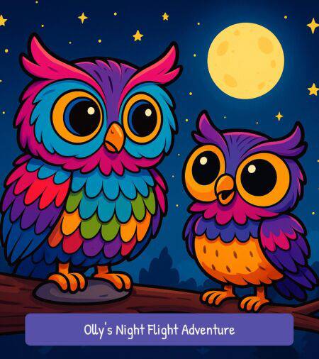Olly the little owl loves his cozy hollow and warm feather bed—but hates the dark. Night feels too big, too strange, too full of shadows… until his brave big sister Nina invites him on his very first night flight. Together they follow twinkling fireflies, swoop through a leafy tree tunnel, skim over Moon Mirror Lake, play echo games with the cliffs, and ride the wind beneath a sky bursting with stars. With every wobbly wingbeat, Olly discovers that the night isn't empty and scary—it's alive, beautiful, and full of secrets only owls get to see.