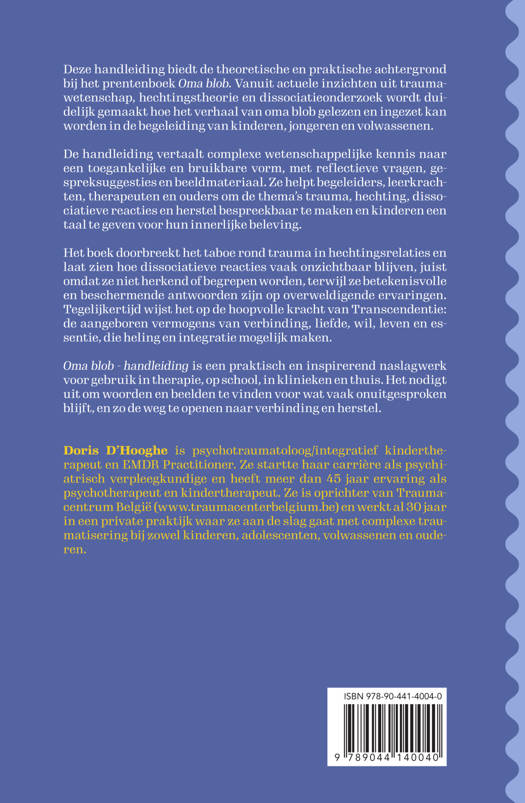 Deze handleiding biedt de theoretische en praktische achtergrond bij het prentenboek Oma blob. Vanuit actuele inzichten uit traumawetenschap, hechtingstheorie en dissociatieonderzoek wordt duidelijk gemaakt hoe het verhaal van oma blob gelezen en ingezet kan worden in de begeleiding van kinderen, jongeren en volwassenen.