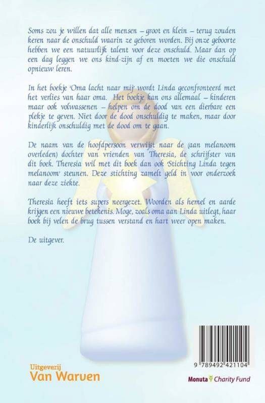 In het boekje 'Oma lacht naar mij' wordt Linda geconfronteerd met het verlies van haar oma. Het boekje kan ons allemaal - kinderen maar ook volwassenen - helpen om de dood van een dierbare een plekje te geven. Niet door de dood onschuldig te maken, maar door kinderlijk onschuldig met de dood om te gaan.