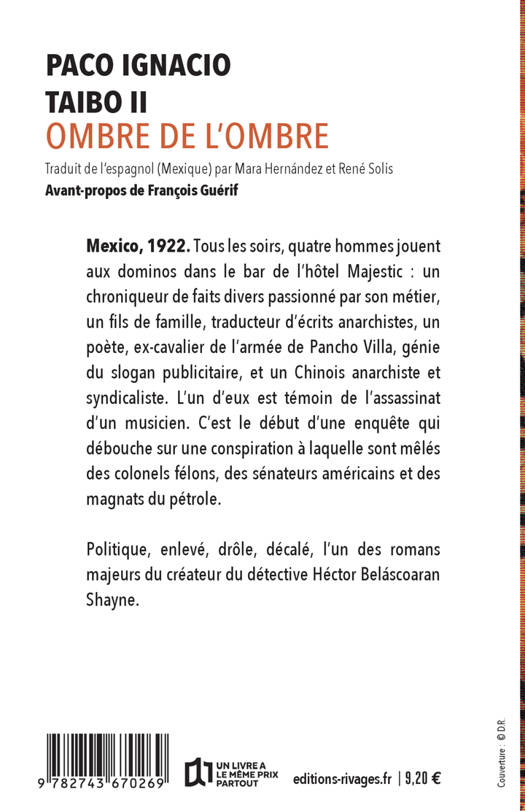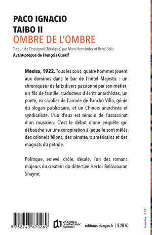 Mexique 1922. Un journaliste spécialisé dans les affaires criminelles, un avocat dont les meilleures clientes sont des prostituées, un poète-virtuose dans l'art du slogan publicitaire et un Chinois anarchiste et syndicaliste se retrouvent le soir au bar de l'hôtel Majestic pour jouer aux dominos. L'assassinat d'un joueur de trombone, la défenestration d'un colonel de l'armée, des fusillades nocturnes, des chocolats empoisonnés et une belle et mystérieuse jeune femme vont entraîner les quatre amis loin de leurs chers dominos, au milieu d'un complot qui unit des colonels félons, des sénateurs américains et quelques compagnies pétrolières. Les conspirations sont une ombre - sans profil, sans objectifs clairs. Et nous, qui les poursuivons par à-coups, comme des enfants qui courent à l'aveugle.