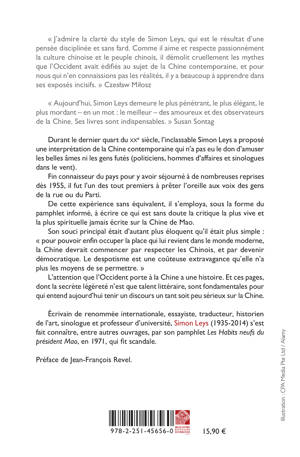 Durant le dernier quart du XXe siecle, l'inclassable Simon Leys a propose une interpretation de la Chine contemporaine qui n'a pas eu le don d'amuser les belles ames ni les gens futes (politiciens, hommes d'affaires et sinologues dans le vent). Fin connaisseur du pays pour y avoir sejourne a de nombreuses reprises des 1955, il fut l'un des tout premiers a preter l'oreille aux voix des gens de la rue ou du Parti. De cette experience sans equivalent, il s'employa, sous la forme du pamphlet informe, a ecrire ce qui est sans doute la critique la plus vive et la plus spirituelle jamais ecrite sur la Chine de Mao. Son souci principal etait d'autant plus eloquent qu'il etait plus simple: " pour pouvoir enfin occuper la place qui lui revient dans le monde moderne, la Chine devrait commencer par respecter les Chinois, et par devenir democratique. Le despotisme est une couteuse extravagance qu'elle n'a plus les moyens de se permettre. " L'attention que l'Occident porte a la Chine a une histoire. Et ces pages, dont la secrete legerete n'est que talent litteraire, sont fondamentales pour qui entend aujourd'hui tenir un discours un tant soit peu serieux sur la Chine.