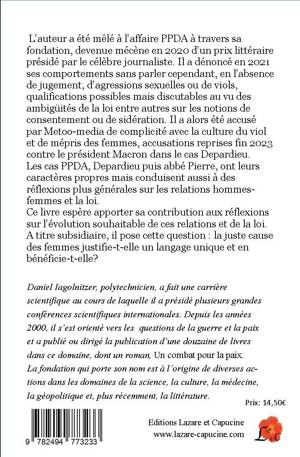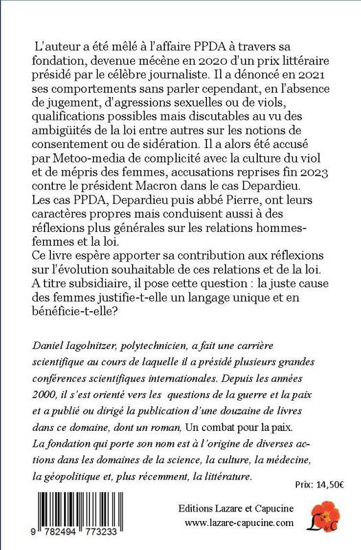 L’auteur a été mêlé à l’affaire PPDA à travers sa fondation, devenue mécène en 2020 d’un prix littéraire présidé par PPDA. Il a dénoncé en 2021 ses comportements sans parler cependant, en l’absence de jugement, d’agressions sexuelles ou de viols, qualifications discutables au vu des ambigüités de la loi sur les notions de consentement ou de sidération. Il a alors été accusé par Metoo-media de complicité avec la culture du viol et de mépris des femmes, accusations reprises fin 2023 contre le président Macron dans le cas Depardieu. Le livre analyse la loi et les témoignages dans les cas PPDA et Depardieu (qui avait, lui, un langage et des comportements grossiers y compris en public : « c’était Gérard ») Il apporte ainsi sa contribution aux réflexions nécessaires sur l’évolution souhaitable de la loi, des mentalités et des relations entre hommes et femmes. A titre subsidiaire, il pose la question : la juste cause des femmes justifie-t-elle les outrances de Metoo-media? Y compris envers ceux qui, comme le présent auteur, ont toujours soutenu cette cause mais gardent leur liberté de pensée. Daniel Iagolnitzer, polytechnicien, a fait une carrière scientifique au cours de laquelle il a présidé plusieurs grandes conférences scientifiques internationales. Depuis les années 2000, il s’est orienté vers les questions liées à la guerre et la paix et a publié ou dirigé la publication d’une douzaine de livres dans ce domaine dont un premier roman, Un combat pour la paix. La fondation qu’il a créée est à l’origine de diverses actions dans les domaines de la science, la culture, la médecine et la géopolitique.