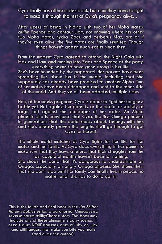Now, at ten weeks pregnant, Cyra is about to fight her toughest battle yet. Not against her parents, or the media, or society at large, but against the kidnapper of her mates. An Alpha phoenix who is convinced that Cyra, the first Omega phoenix in generations that the world knows about, belongs with her, and she's already proven the lengths she'll go through to get Cyra for herself.