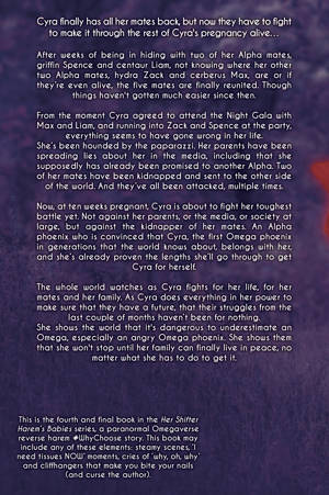 This is the fourth and final book in the Her Shifter Harem's Babies series, a paranormal Omegaverse reverse harem #WhyChoose story. This book may include any of these elements: steamy scenes, 'I need tissues NOW' moments, cries of 'why, oh, why' and cliffhangers that make you bite your nails (and curse the author).