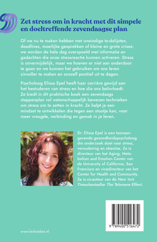 Psycholoog Elissa Epel heeft haar carrière gewijd aan het bestuderen van stress en hoe die ons beïnvloedt. Ze biedt in dit praktische boek een zevendaags stappenplan vol wetenschappelijk bewezen technieken om stress om te zetten in kracht. Ze helpt je een mindset te ontwikkelen die tegen een stootje kan, voor meer vreugde, verbinding en gemak in je leven.