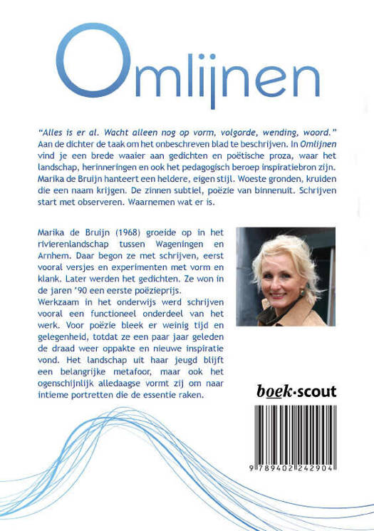 "Alles is er al. Wacht alleen nog op vorm, volgorde, wending, woord."Aan de dichter de taak om het onbeschreven blad te beschrijven. In Omlijnen vind je een brede waaier aan gedichten en poëtische proza, waar het landschap, herinneringen en ook het pedagogisch beroep inspiratiebron zijn.Marika de Bruijn hanteert een heldere, eigen stijl. Woeste gronden, kruiden die een naam krijgen. De zinnen subtiel, poëzie van binnenuit. Schrijven start met observeren. Waarnemen wat er is.