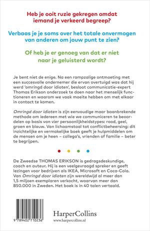 Welke gedragsstijl is de jouwe? Drijf je collega je tot waanzin met zijn overdreven liefde voor details? Botst het gematigde karakter van je geliefde met je eigen enthousiasme? Sommige mensen beweren dat zij omringd worden door idioten. Zij begrijpen hun collega’s of familie niet, hoe ze ook hun best doen. Als je echter meer inzicht hebt in het gedrag van de ander, en dat van jezelf, kun je beter met de ander communiceren. Een veelgebruikte methode daarvoor is het aanduiden van gedragsstijlen met kleuren. Ben je bijvoorbeeld rood, dan wil je snel tot de kern van de zaak komen. Heb je voornamelijk gele kanten, dan ben je snel enthousiast, groen staat voor stabiliteit en blauwe eigenschappen hebben te maken met informatie en details. Thomas Erikson leert je om op praktische en eenvoudige wijze dit kleurenschema toe te passen. Omringd door idioten helpt je collega’s, vrienden en familie beter te begrijpen.
