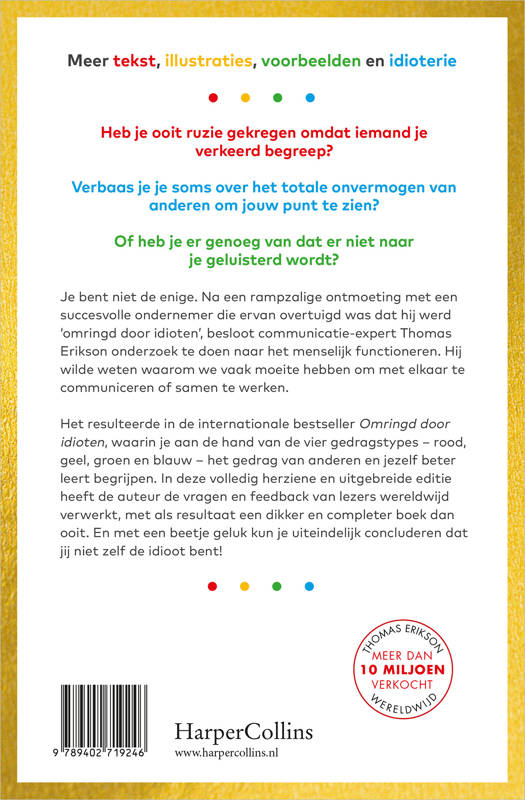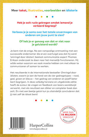 Het resulteerde in de internationale bestseller Omringd door idioten, waarin je aan de hand van de vier gedragstypes – rood, geel, groen en blauw – het gedrag van anderen en jezelf beter leert begrijpen. In deze volledig herziene en uitgebreide editie heeft de auteur de vragen en feedback van lezers wereldwijd verwerkt, met als resultaat een dikker en completer boek dan
