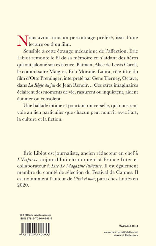 Sensible à cette étrange mécanique de l’affection, Éric Libiot remonte le fil de sa mémoire en s’aidant des héros qui ont jalonné son existence. Batman, Alice de Lewis Caroll, le commissaire Maigret, Bob Morane, Laura, rôle-titre du film d’Otto Preminger, interprété par Gene Tierney, Octave, dans LaRègle du jeu de Jean Renoir… Ces êtres imaginaires éclairent des moments de vie, rassurent ou inquiètent, aident à aimer ou consolent.