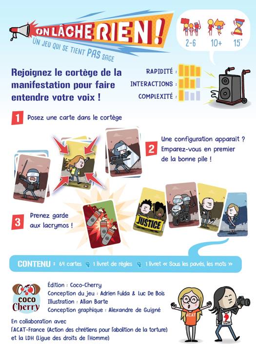 Rejoignez le cortège de la manifestation pour faire entendre votre voix ! On lâche rien ! est un jeu de rapidité pour tout public. - Posez une carte dans le cortège. - Une configuration apparaît ? Emparez-vous en premier de la bonne pile ! - Prenez garde aux lacrymos ! Le jeu est fabriqué en France et illustré par Allan Barte. Il inclut un livret de 32 pages rédigé par deux associations qui luttent pour la liberté de manifester et dénoncent les violences policières : l'ACAT-France (Action des chrétiens pour l'abolition de la torture) et la LDH (Ligue des droits de l'Homme).