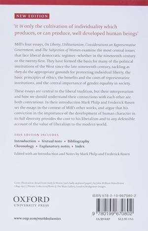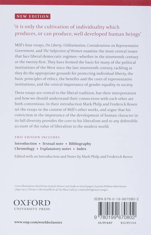 These essays are central to the liberal tradition, but their interpretation and how we should understand their connection with each other are both contentious. In their introduction Mark Philp and Frederick Rosen set the essays in the context of Mill's other works, and argue that his conviction in the importance of the development of human character in its full diversity provides the core to his liberalism and to any defensible account of the value of liberalism to the modern world.