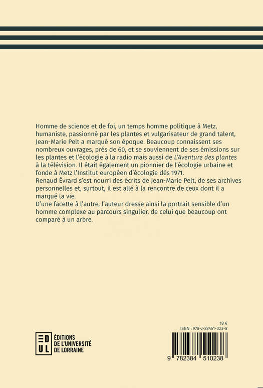 Homme de science et de foi, un temps homme politique à Metz, humaniste, passionné par les plantes et vulgarisateur de grand talent, Jean-Marie Pelt a marqué son époque. Beaucoup connaissent ses nombreux ouvrages, près de 60, visant le grand public et se souviennent de ses émissions radiophoniques sur les plantes et l'écologie (notamment Chroniques écologiques sur RTL ou Hexagonale Poursuite sur France Inter) ou de L'Aventure des plantes à la télévision. Il était également un pionnier de l'écologie urbaine et a fondé à Metz l'Institut européen d'écologie dès 1971. Cette biographie raconte les différentes facettes d'un homme complexe au parcours singulier.